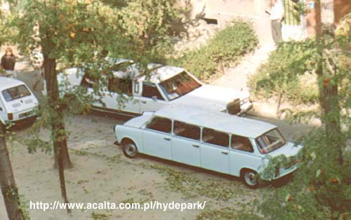 Wehicle Limousine - opis techniczny Ospoilerowany, bezwypadkowy, w dobrym stanie. Lakier metalik matowany szmerglem, szyby przyciemniane sprayem do pielęgnacji obuwia z nubuku, chromowana krata wlotu powietrza i końcówka rury wydechowej. Szyberdach na zawiasach, alufelgi, sprzęt stereo also playable mono Panascanix plus 2 kasety gratis. Antena wysuwana "one man operated". Komputer pokładowy ZX Spectrum 48k z magnetofonem. Podgrzewane lusterka i szyby (propan-butan), centralny zamek Gerda Tytan, klimatyzacja "Polar", barek, lodówka, zlewozmywak dwukomorowy, kuchenka mikrofalowa z grillem, siedzenia lotnicze kubełkowe, poduszka dla kierowcy, kołdra dla pasażera, antyalergiczne pasy bezpieczeństwa, regulowane z zewnątrz popielniczki, dodatkowy zbiornik 350 litrów na tylnym siedzeniu. Silnik 2000 ccm dolnozaworowy od "Warszawy 233" po kapitalnym remoncie, zapłon elektroniczny bateryjny ruski, wtrysk bezpośredni z miejsca kierowcy. Obniżone zawieszenie, hamulce ze wspomaganiem z miejsca pasażera. Ubezpieczony od ognia, powietrza i wody. |